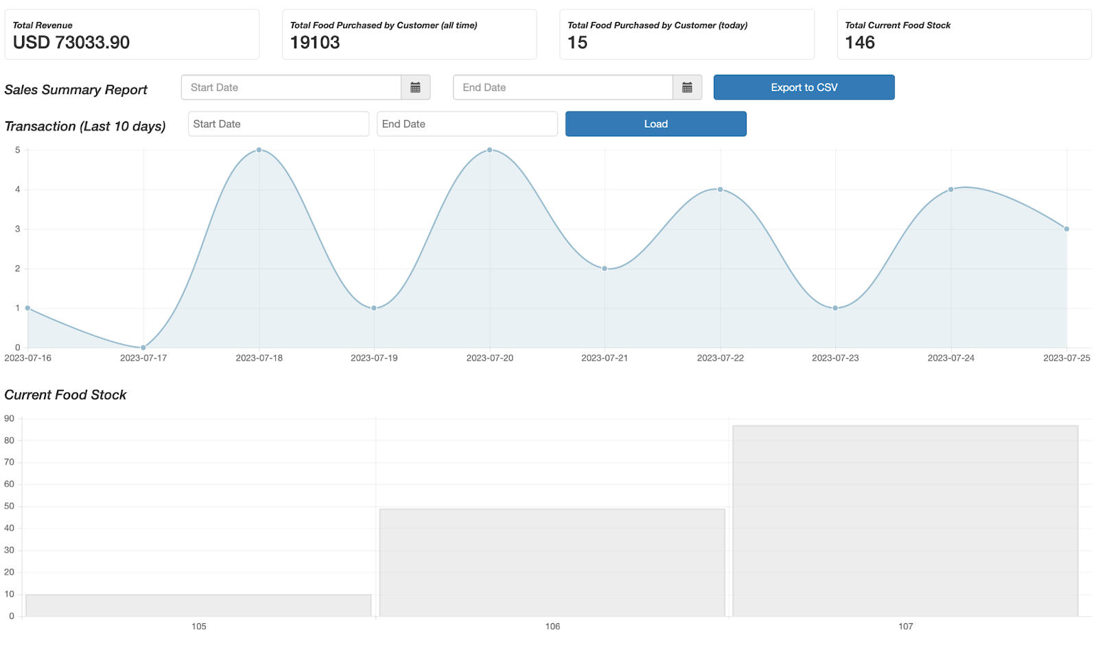 Current Food Stock - inventory quantity by microstore. Clicking on the shaded gray bars displays real-time inventory list for that given microstore.