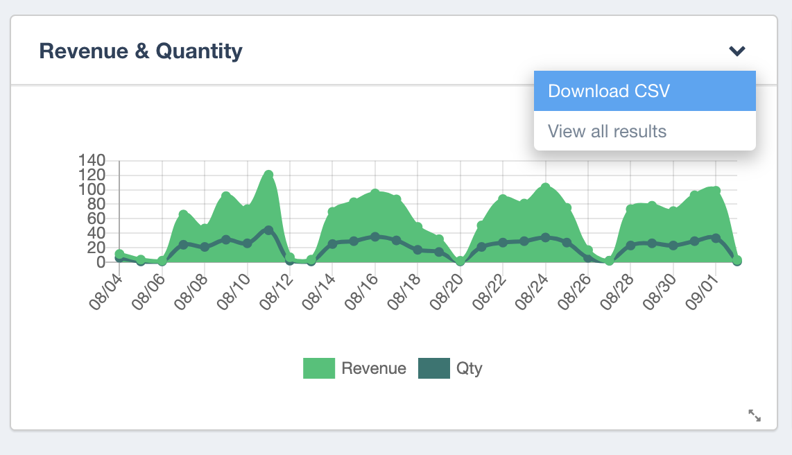 To export data for any of these data, simply click on the down arrow on the top right corner of the desired graph and select “Download CSV.” For example, a revenue report can be exported like so: