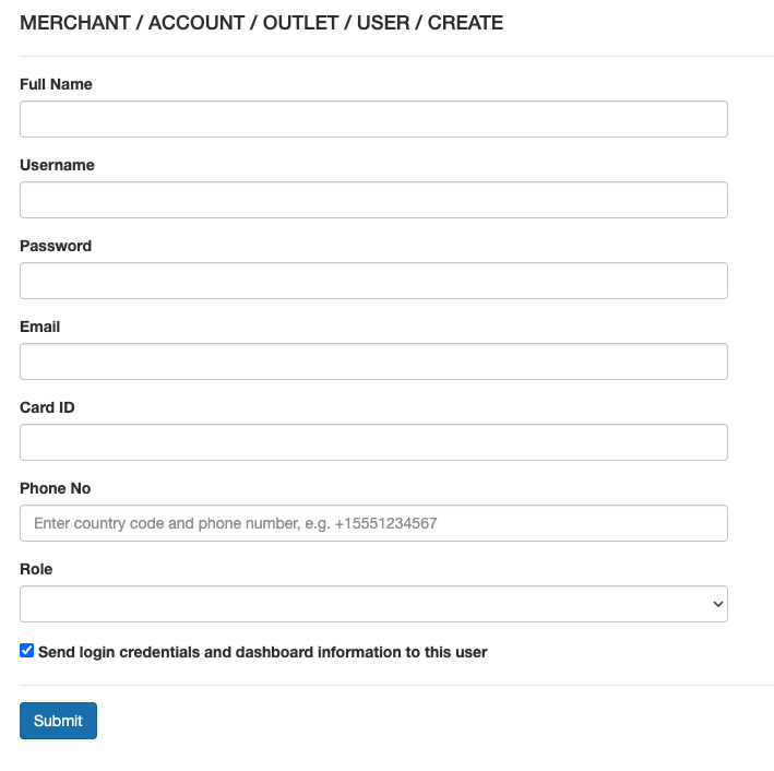 - You will be taken to the user creation page. All fields except Card ID are required. For the password field, you need to include